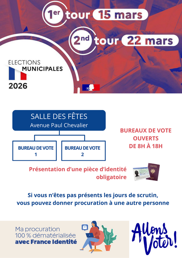 Dimanche 15 mars Salle des fêtes Bureaux de vote ouverts de 8h à 18h